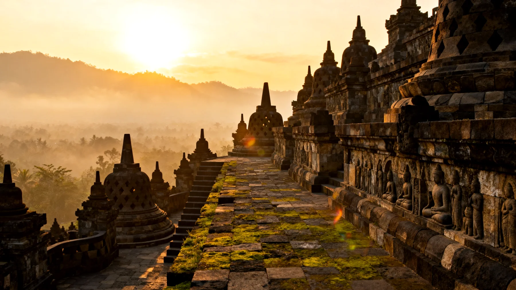 Costruito nel IX secolo, Borobudur non è semplicemente un monumento: è un mandala tridimensionale che racconta la via verso l’illuminazione attraverso 2.672 pannelli in bassorilievo e 504 statue di Buddha. La struttura si sviluppa su nove livelli sovrapposti, rappresentando i tre regni del buddhismo: il mondo del desiderio, delle forme e dell’assenza di forme. Camminare lungo i suoi corridoi circolari significa compiere un viaggio spirituale che si addice perfettamente all’inizio di una nuova vita insieme.