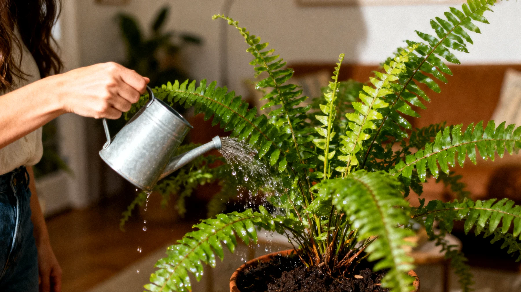 Questo è ciò che succede nella maggior parte dei casi: la felce è stata coltivata in una serra ad umidità controllata e luce diffusa costante. In questi ambienti protetti, le condizioni sono ideali e stabili, permettendo alla pianta di svilupparsi rigogliosa. Poi, improvvisamente, viene esposta in un negozio secco, pieno di correnti d’aria e luci artificiali. Rimane lì per giorni o settimane, iniziando a subire carenze e sviluppare microstress invisibili all’occhio inesperto. Infine viene comprata e spostata in un appartamento secco e scarsamente illuminato.